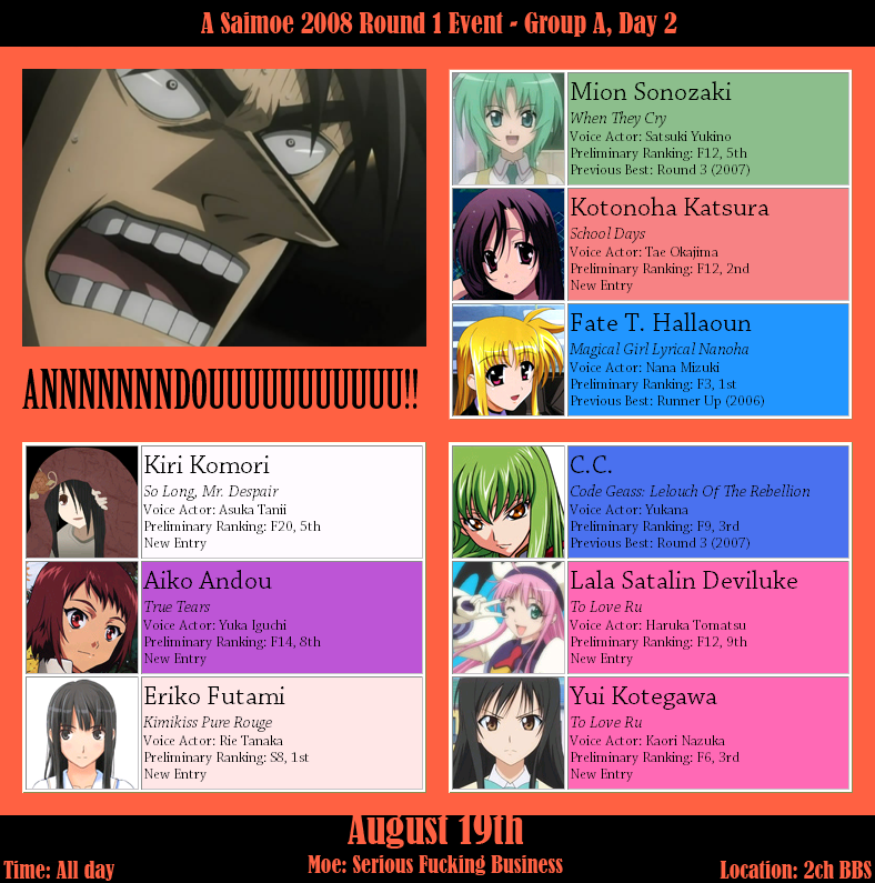 August 19th 2008 ![]() A02 (1426 votes total) 1st 670 (46.98%) Kiri Komori @ So Long, Mr. Despair