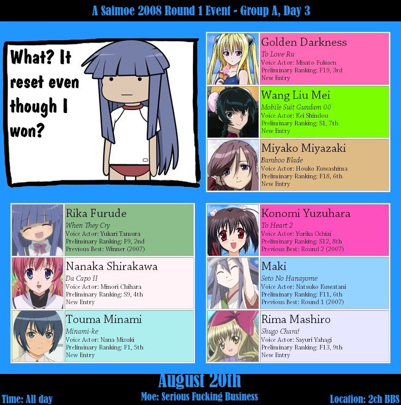 2nd 557 (39.36%) Touma Minami @ Minami-ke 3rd 206 (14.56%) Nanaka Shirakawa @ Da Capo II ![]() A07 (1334 votes total) 1st 668 (50.07%) Golden Darkness @ To Love Ru