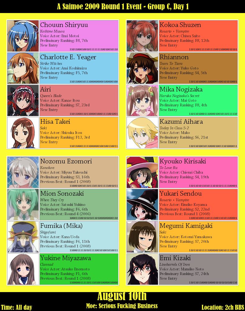 August 10th 2009 ![]() C01 (1006 votes total) 1st 473 (47.02%) Hisa Takei @ Saki