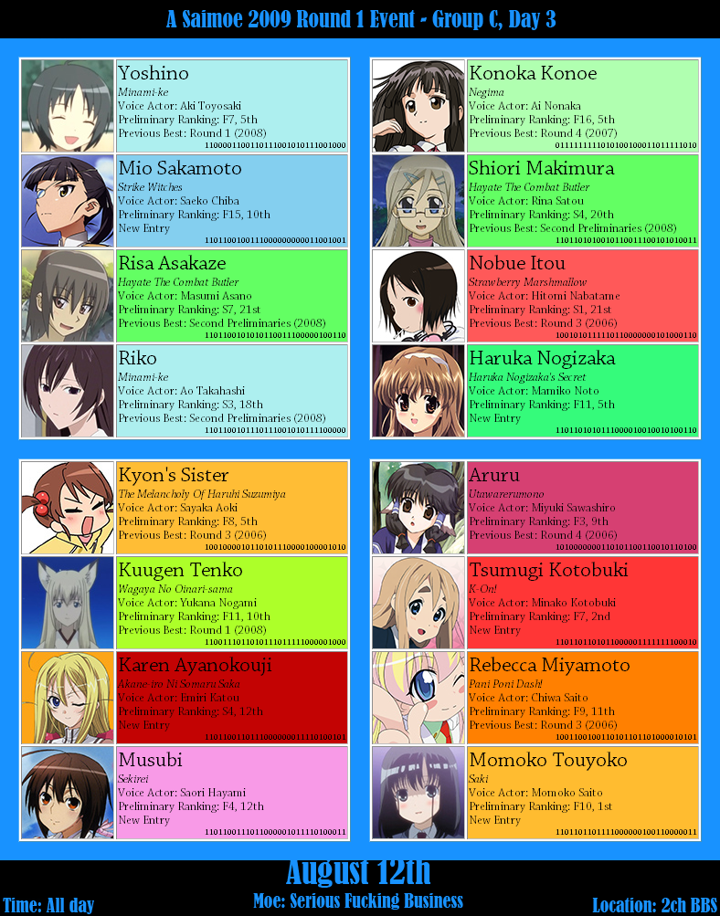 August 12th 2009 ![]() C03 (1104 votes total) 1st 488 (44.20%) Mio Sakamoto @ Strike Witches