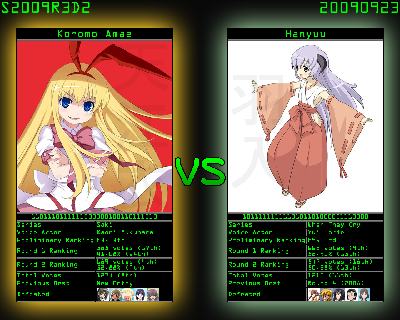 2nd 559 (41.62%) Mion Sonozaki @ When They Cry ![]() D2 (1358 votes total) 1st 792 (58.32%) Koromo Amae @ Saki