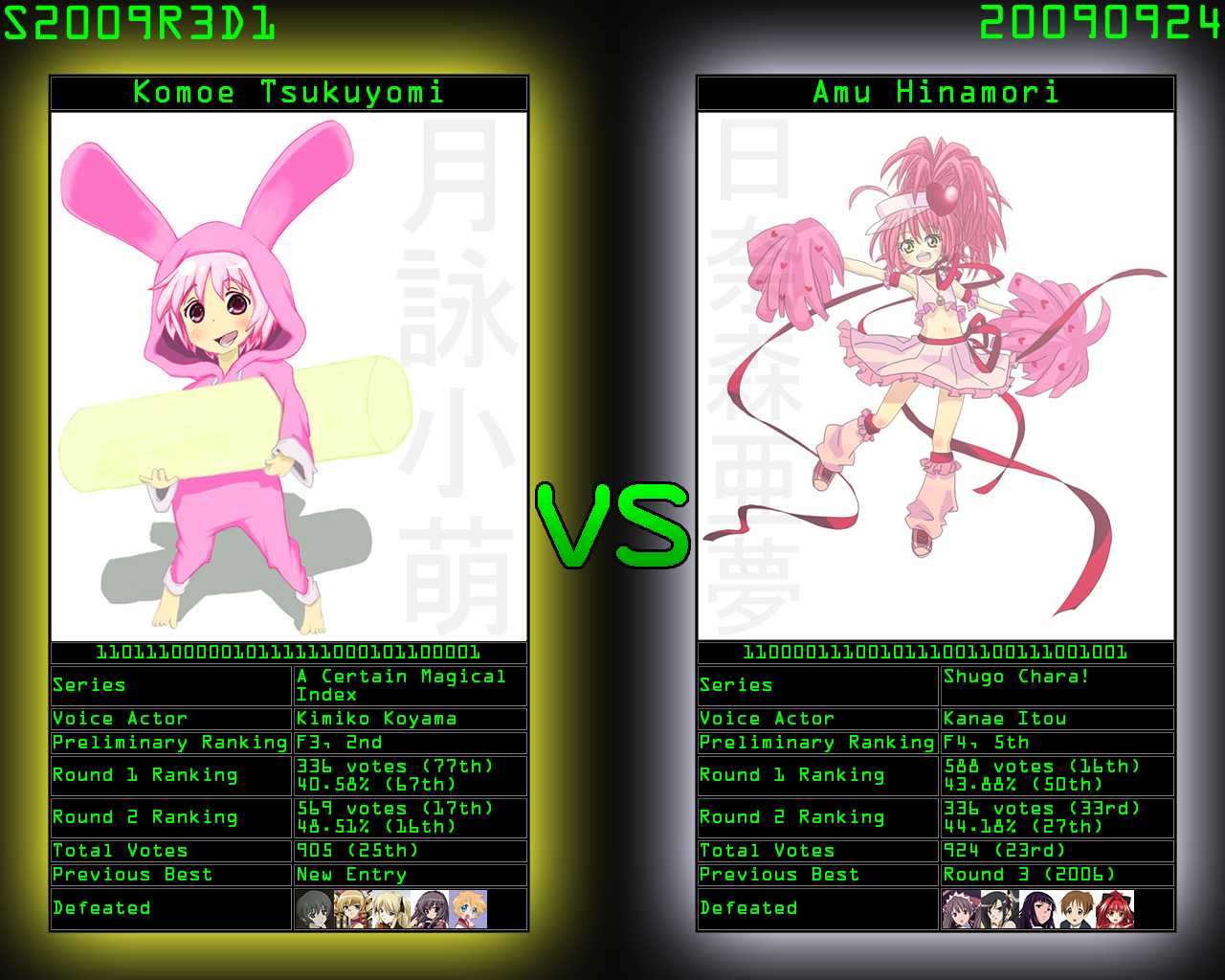 2nd 657 (46.04%) Kyou Fujibayashi @ Clannad ![]() D1 (1201 votes total) 1st 655 (54.54%) Amu Hinamori @ Shugo Chara!
