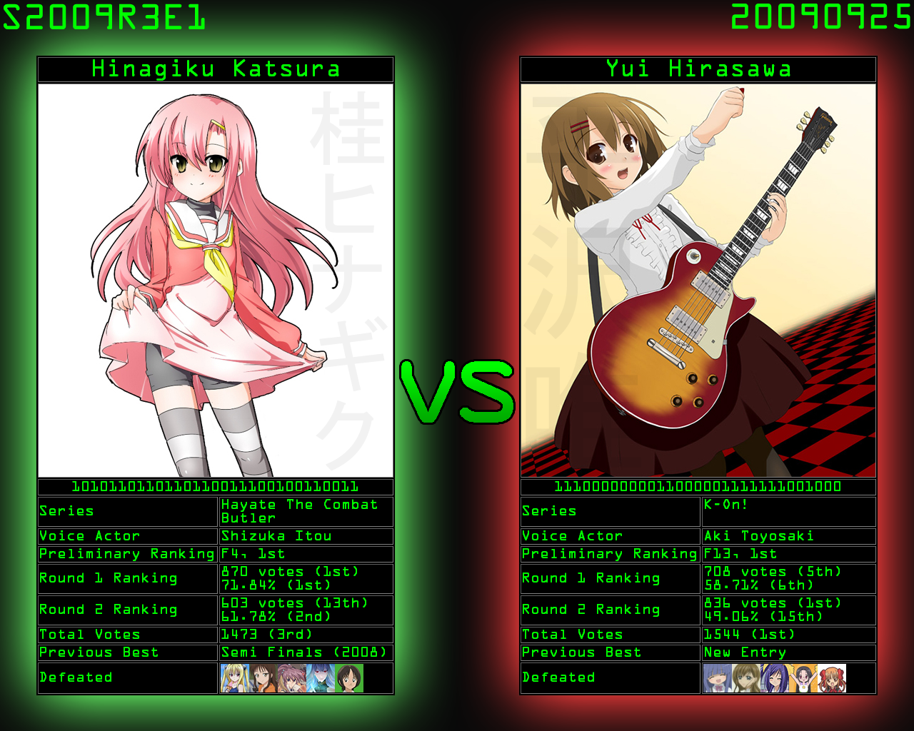 2nd 935 (49.52%) Hinagiku Katsura @ Hayate The Combat Butler ![]() F2 (1608 votes total) 1st 885 (55.04%) Azusa Nakano @ K-On!
