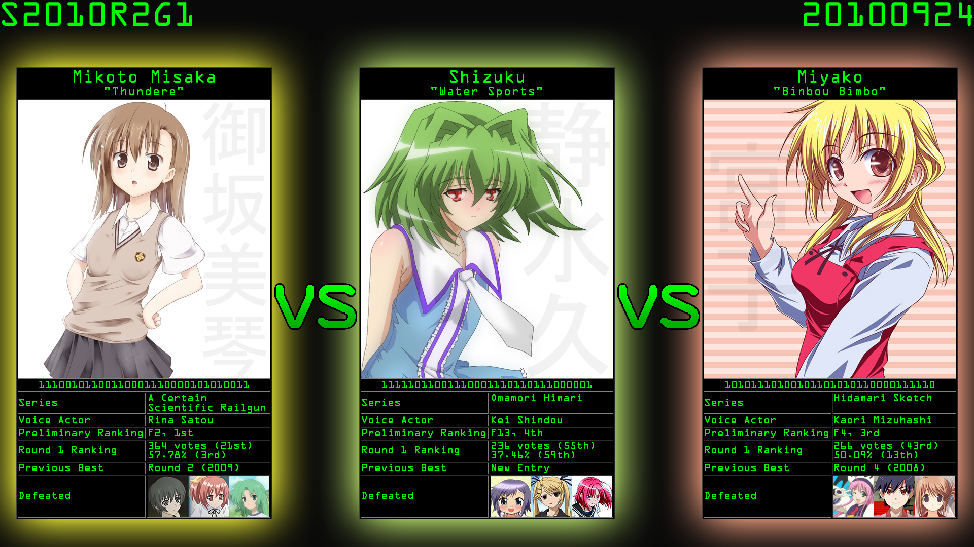 September 24th 2010 ![]() Click to enlarge. G1 (1404 votes total) 1st 662 (47.15%) Mikoto Misaka @ A Certain Magical Index