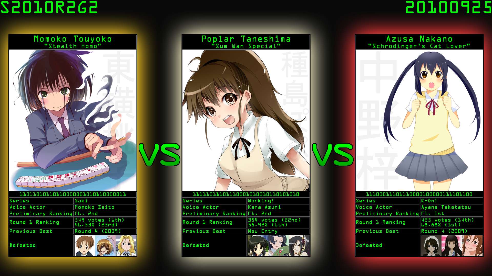 September 25th 2010 ![]() Click to enlarge. G2 (1377 votes total) 1st 653 (47.42%) Azusa Nakano @ K-On!