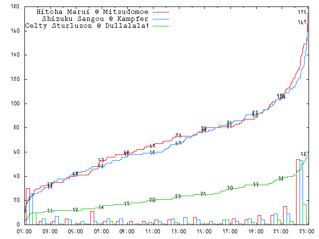 2nd 167 (41.75%) Shizuku Sangou @ Kampfer 3rd 58 (14.50%) Celty Sturluson @ Dullalala! ![]() 1st 228 (55.21%) Miyako @ Hidamari Sketch