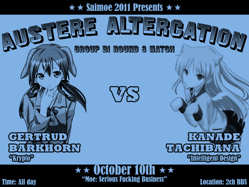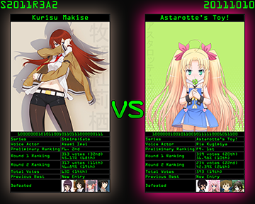 2nd 410 (49.40%) Kurisu Makise @ Steins;Gate ![]() B1 (835 votes total) 1st 474 (56.77%) Kanade Tachibana @ Angel Beats!