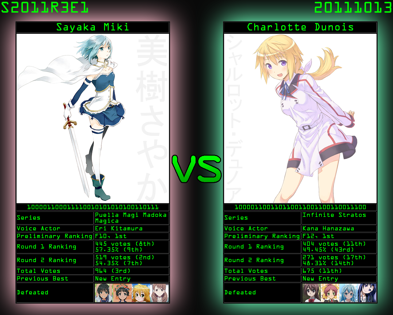 October 13th 2011 ![]() Click to enlarge. E1 (915 votes total) 1st 519 (56.72%) Sayaka Miki @ Puella Magi Madoka Magica