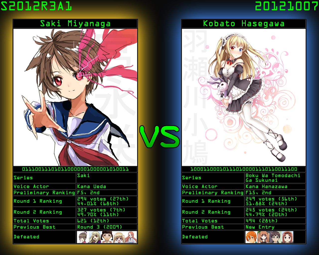 October 7th 2012 ![]() Click to enlarge. A1 (613 votes total) 1st 321 (52.37%) Saki Miyanaga @ Saki
